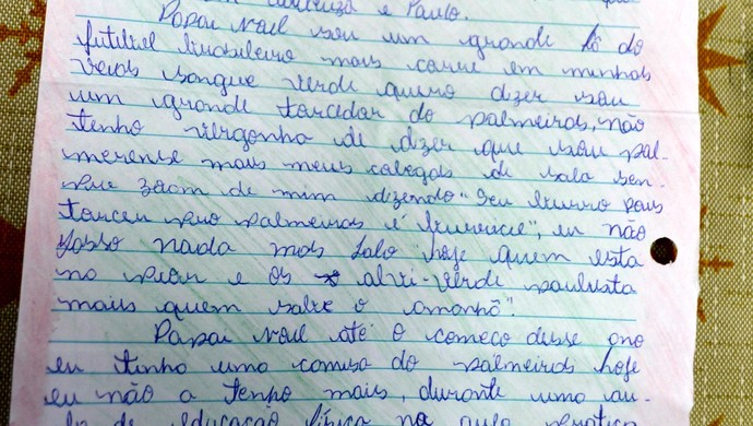 Na carta em questão, coletada por uma estudante acreana, o menino diz que é torcedor do Palmeiras e que em suas veias corre "sangue verde". Ele afirma que chega a ser "zoado" pelos colegas, que dizem que torcer para o Verdão é "burrice", mas não se importa, e ainda revela: chegou a ter uma camisa do time de coração no início do ano, mas acabou perdendo-a após uma aula de educação física, na qual o uniforme foi rasgado.