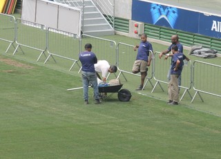 A grande alteração no gramado que ainda deve estar visível nesta quarta-feira está próximo ao meio de campo. Ali foi montado parte da estrutura do palco que recebeu a apresentação de Rod Stewart, no dia 19.