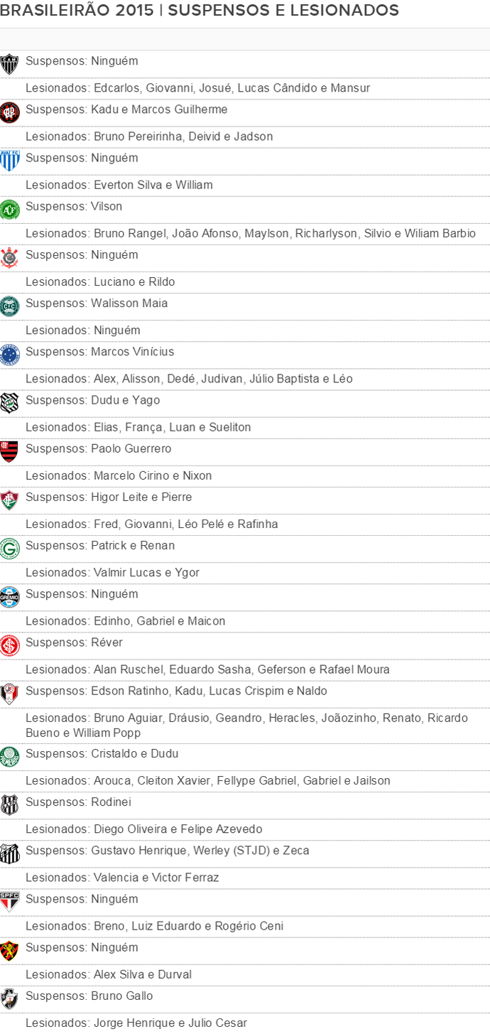 No Inter, bruxa solta no ataque. Rafael Moura só volta em 2016, e Eduardo Sasha, de média 3.41 no jogo, também está no DM. O zagueiro Réver está suspenso. A Ponte Preta, adversário do Colorado, perdeu dois homens de frente (Diego Oliveira e Felipe Azevedo, ambos machucados), além do lateral Rodinei, por terceiro amarelo. As duplas Dudu e Yago, do Figueirense, e Kadu e Marcos Guilherme, do Atlético-PR, completam o show de suspensões.