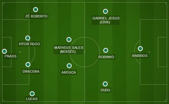 No ataque, Erik, autor de um gol na vitória sobre o River Plate e de uma assistência no triunfo sobre o Libertad, foi testado na vaga de Gabriel Jesus. Fez o que pode: saiu do ataque para buscar a bola, tentou se aproveitar da própria velocidade, mas também esbarrou nos marcadores do Nacional.