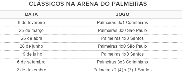 O início de ano do Palmeiras não correspondeu às expectativas da torcida. A estreia em casa, muito menos. No primeiro jogo de 2016 na arena onde conquistou a Copa do Brasil do ano passado, o Verdão perdeu por 2 a 1 para o Linense, de virada. Contra o Santos, neste sábado, às 17h (horário de Brasília), o clube confia no bom retrospecto em clássicos na sua casa para vencer o rival e encerrar o jejum de quatro partidas sem triunfo.