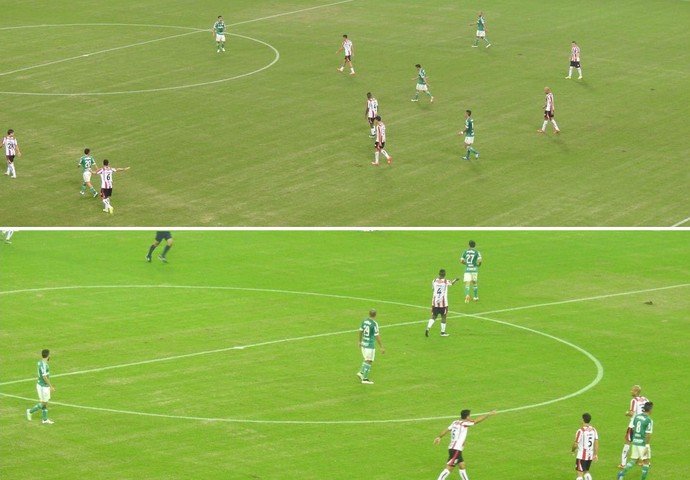 Antes disso, o Palmeiras entrou em campo determinado a fazer a parte dele. Os primeiros minutos mostraram bem o que seria a partida para os alviverdes: marcação pressão na saída de bola, rápida troca de passes, participação efetiva dos volantes e laterais, compactação no meio e chutes de fora da área. Resumindo, quase tudo o que faltou ao Verdão de Marcelo Oliveira começa a virar marca do time de Cuca.