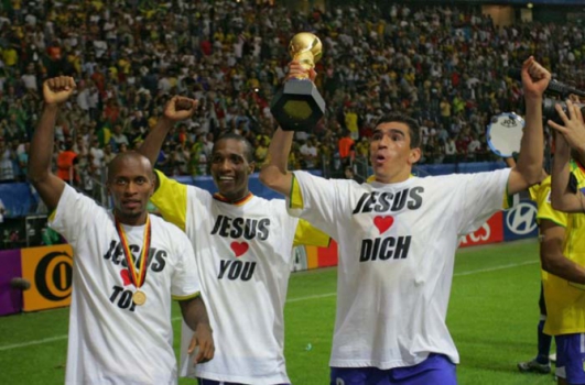 Zé Roberto comemora o título da Copa das Confederações de 2005 com a Seleção Brasileira (Foto: AFP/OLIVER LANG)