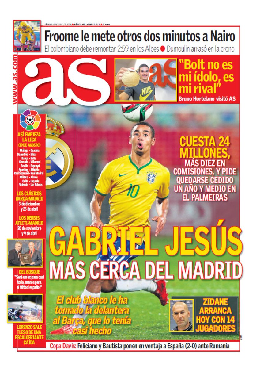 O Real Madrid teria ?passado a frente do Barcelona na corrida para assinar com Gabriel Jesus. Segundo o Diário Ás, o clube merengue teria atravessado o negócio do Palmeiras com o rival, tornando-se agora o principal candidato a assinar com a joia do Verdão.