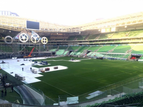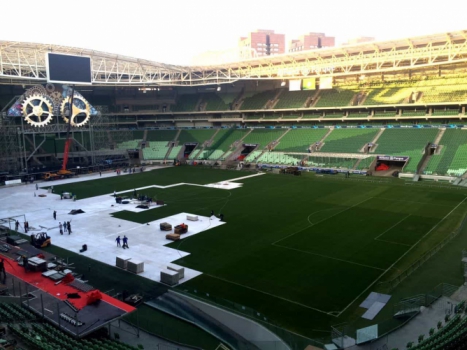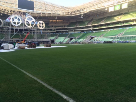 O único ponto que apresenta marcas é o Gol Norte, mas para minimizar os efeitos do show a organização deve usar o viveiro de 500 metros quadrados, instalado no estádio no início deste ano, para repor pequenos pedaços do estádio. O jogo entre Verdão e Fla está marcado para as 21h45.