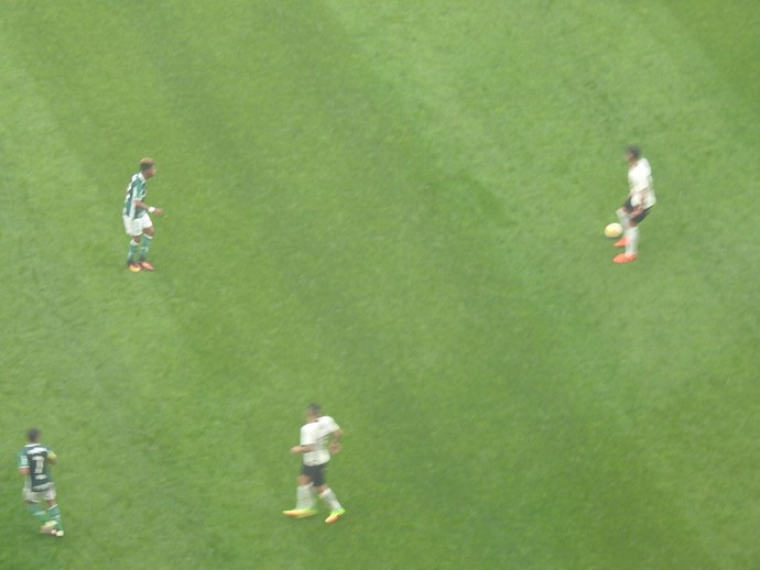 A marcação alviverde dificultava as coisas para um Corinthians limitado tecnicamente. Se abria mão do posse de bola (terminou com 41%, contra 59% do rival), o Palmeiras fazia valer os desarmes (foram 34, contra apenas 18 dos donos da casa) e, quando chegava, mostrava perigo. Basta ver que o Alvinegro teve 14 finalizações, mas apenas uma chance real de gol, contra 12 finalizações do Verdão – oito chances reais.