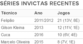 Essa série, o comandante atual atingiu duas vezes, a última delas ao empatar com o Grêmio. Com o empate diante do Flamengo e a vitória sobre o Corinthians, sua invencibilidade chegou a 10 partidas (seis vitórias e quatro empates) e já superou os números de Marcelo Oliveira. O último revés na temporada foi para o Botafogo, há quase dois meses (em 31 de julho).