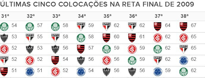 Passadas 31 das 38 rodadas, o Verdão já soma 64 pontos, dois a mais do que a pontuação final de sete anos atrás. Além disso, tem quatro pontos de vantagem sobre o vice-líder, o Flamengo. Naquela edição, à essa altura, a distância sobre o Atlético-MG, então segundo colocado, era de apenas um ponto (veja abaixo a na reta final). Outro detalhe importante: a maior diferença já registrada para o vice-líder, de cinco pontos em 2009, agora pode ser superada.
