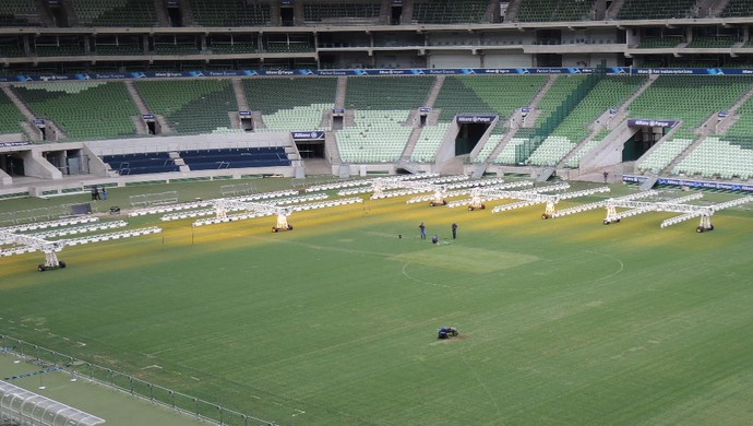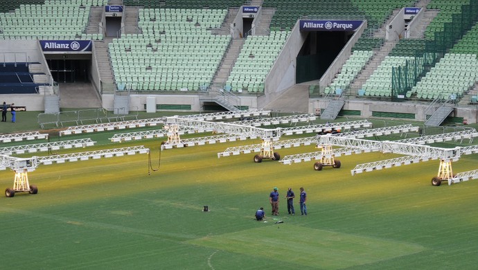 Gramado da arena do Palmeiras recebe tratamento especial para recuperação (Foto: Felipe Zito)
