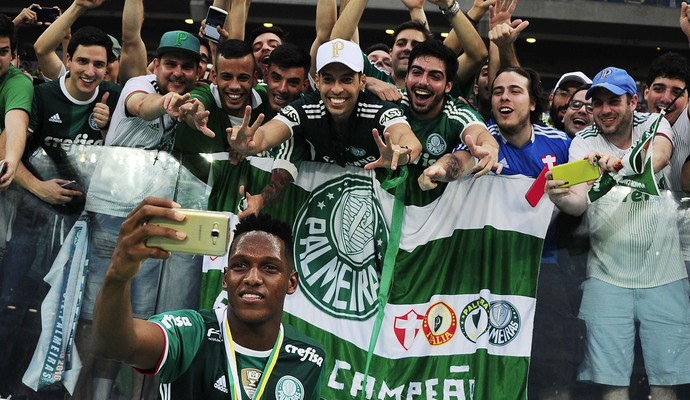 Mina faz selfie com a torcida do Palmeiras após a conquista do Campeonato Brasileiro (Foto: Marcos Ribolli)