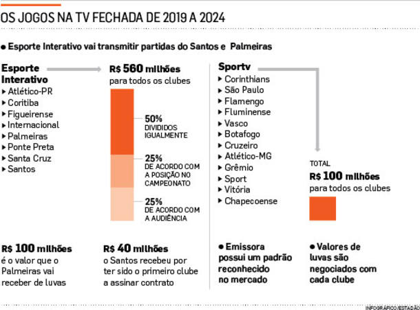 A opção pelo Esporte Interativo, feita por oito clubes da Série A, foi motivada principalmente pelos valores financeiros. A oferta do canal controlado pelo grupo Turner, multinacional da área de comunicação e entretenimento, é cinco vezes maior do que foi oferecido pelo SporTV. São R$ 560 milhões de um lado contra R$ 100 milhões do outro. Vale lembrar que todas as informações se referem à TV fechada. As transmissões pelos canais abertos continuam sob o domínio da Rede Globo. Todos os acordos são válidos de 2019 a 2024.