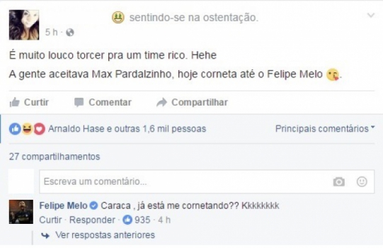 Em São Paulo (SP) para acertar os últimos detalhes com o Palmeiras, Felipe Melo ainda não foi anunciado pelo atual campeão brasileiro, mas já interage com torcedores do clube. No Facebook, o volante usou sua página no Facebook para responder, em tom de brincadeira, a uma torcedora, que escreveu: "É muito louco torcer para time rico, hehe. A gente aceitava Max Pardalzinho, hoje corneta até o Felipe Melo".