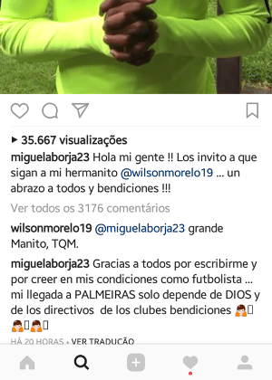 Sensação da última Libertadores pelo campeão Atlético Nacional, o colombiano Miguel Borja, nesta quinta-feira (19), "flertou" com o Palmeiras em várias frentes. Depois de dar entrevista à rádio Bradesco escancarando desejo de jogar no Brasil, o centroavante se manifestou no Instagram e disse que o acordo com o alviverde paulista só depende das diretorias.