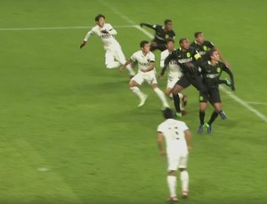 Jogadores do Kashima Antlers em impedimento antes da marcação do pênalti (Foto: Reprodução)