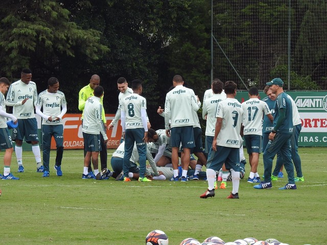 Róger Guedes, aniversariante do dia, sofre "trote" no Palmeiras (Foto: Felipe Zito)
