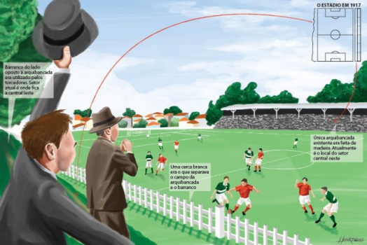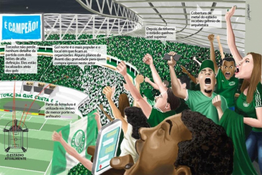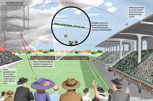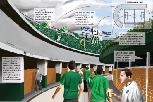 Na galeria ilustrações que recriam as quatro fases da casa do Palmeiras (Artes: Henrique Assale)