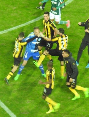 Fernando Prass é agredido por dois jogadores do Peñarol ao mesmo tempo (Foto: Felipe Zito)