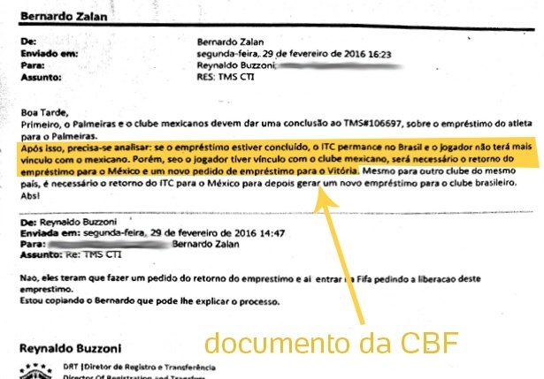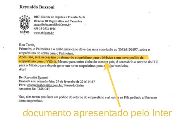 O Inter diz que anexou os documentos sem fazer qualquer verificação porque corria contra o tempo. Crente que Vitória e CBF não mostrariam os originais e confiante que aqueles eram os emails trocados entre clube e entidade, o Colorado corria para que o processo fosse reaberto. Disputava com o Vitória ponto a ponto a permanência na Série A e não queria deixar que o campeonato acabasse antes do fim do processo, de olho na perda de pontos do clube baiano. O Inter ainda entendia que a CBF estaria indicando o Vitória a proceder de uma forma e depois alegando o contrário publicamente. Por isso, queria esclarecimentos.