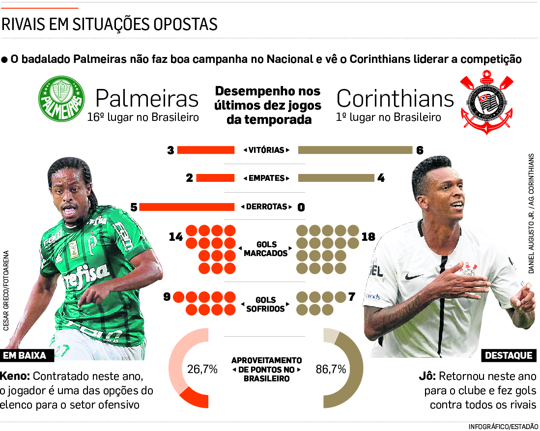 Quase na virada para a segunda metade da temporada, Corinthians e Palmeiras vivem situações contrárias às cotações e expectativas traçadas no começo de 2017. Quem era badalado e vislumbrava um ano bastante promissor, vive agora turbulência e vê seu maior rival, antigo azarão no ano, desfrutar de ótima fase.