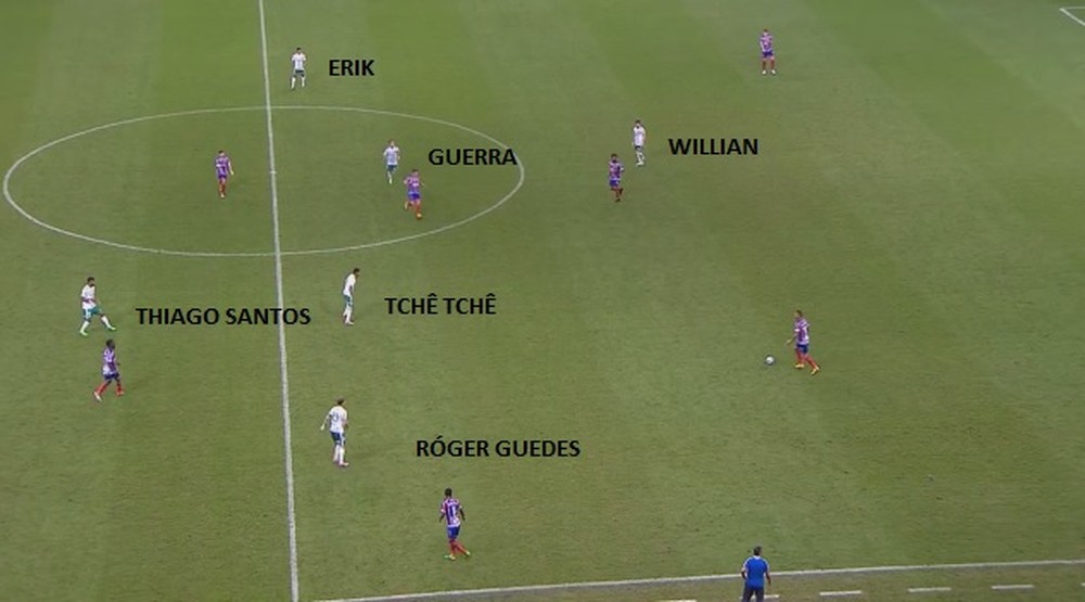 A tática palmeirense foi interessante. Com uma postura de pressionar o adversário no campo de defesa e adiantar a linha de marcação, o Verdão tentou tirar espaços do Bahia e obrigar ao rival a fazer a ligação direta entre a defesa e o ataque - pelo alto, Mina (1,95m) e Juninho (1,87m) deram boa proteção a Fernando Prass, que mais uma vez teve atuação segura.