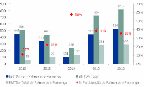 Segundo dados do levantamento tendo como base os balanços financeiros divulgados pelos clubes em 2016, Flamengo e Palmeiras somam R$ 291 milhões em sobra de caixa de um total de R$ 815 milhões dos clubes incluídos no estudo, . Ou seja, o poder de investimento dupla para quitar dívidas e comprar atletas corresponde a mais da metade que todos os outros 25 maiores clubes do país.