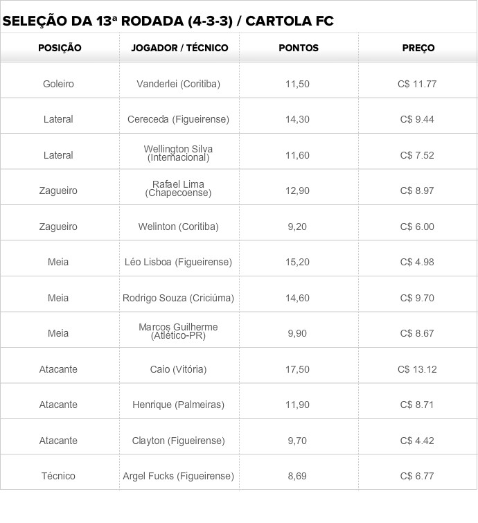 Sem muito cartaz com os cartoleiros, o atacante Caio foi o maior pontuador da 13ª rodada. Ele anotou os dois gols do Vitória no triunfo de virada sobre o Grêmio e alcançou 17,50 pontos. No Morumbi, o São Paulo era dado como favorito diante do Criciúma. No entanto, o Tigre não temeu a partida e buscou o empate com gol de Rodrigo Souza. Assim sendo, o volante pontuou muito bem e ficou na seleção da rodada com 14,60.