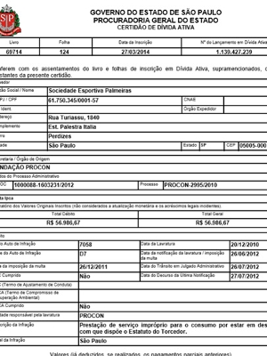 O Palmeiras foi acionado na Justiça pela Fazenda do Estado de São Paulo por dívida com o Procon do ano de 2012. O curioso é que o valor que consta no impasse é de apenas R$ 77.628,89. A ESPN.com.br teve acesso aos documentos referentes ao caso.