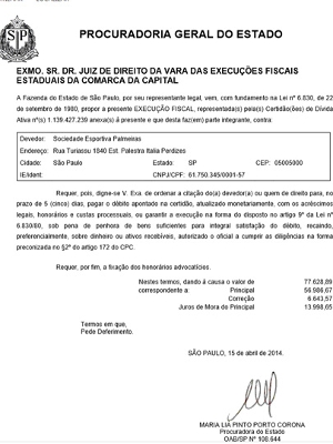 De acordo com documento datado de 15 de abril de 2014 assinado pela procuradoria geral do estado e obtido pelo ESPN.com.br, a causa tinha o valor de R$ 77.628,89, sendo R$ 56.986,67 de números principais, mais correção monetária de R$ 6643,57 e juros de R$ 13.998,65. Outro papel, de 22 de maio de 2014, citava o Palmeiras judicialmente por meio da Fazenda do Estado de São Paulo.