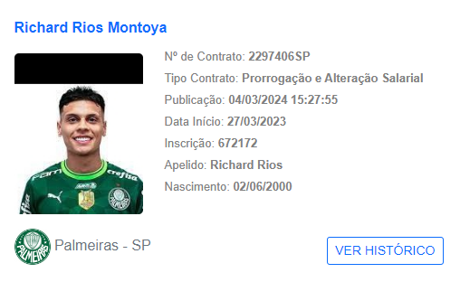 Nesta segunda-feira, o Palmeiras ampliou o tempo de contrato do meio-campista Richard Ríos. O jogador agora tem vínculo com o Verdão até dezembro de 2026. O contrato anterior tinha validade até dezembro de 2025. Essa é a primeira renovação de contrato do colombiano, que chegou ao clube após se destacar no Guarani durante a disputa do Campeonato Paulista de 2023.