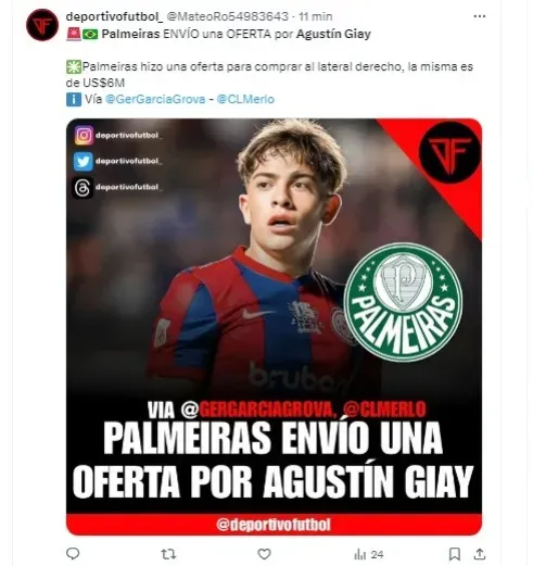 Giay tem um histórico impressionante, tendo sido capitão das seleções de base da Argentina e mostrado seu talento em confrontos contra o próprio Palmeiras na atual edição da CONMEBOL Libertadores. As negociações entre Palmeiras e San Lorenzo foram iniciadas após uma sondagem feita pelo clube brasileiro meses atrás. Em uma reunião recente em São Paulo, Giay foi discutido como um potencial reforço, embora uma proposta concreta ainda não estivesse sobre a mesa.