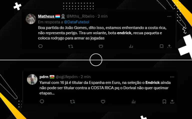 Para o 2° tempo, boa parte da torcida comentou: “seria interessante tirar um volante e colocar o Endrick, a Costa Rica não vai atacar”. Em contrapartida, comparou com Lamine Yamal, jovem da Espanha e do Barcelona: “Yamal com 16 já é titular da Espanha em Euro, na seleção o Endrick ainda não pode ser titular contra a Costa Rica porque o Dorival não quer queimar etapas”.