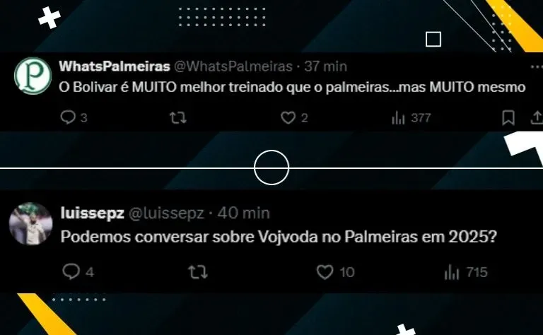 “Eu tô vendo o jogo exatamente pra tirar essa dúvida. Primeiro ponto: Palmeiras não sabe sair do campo de defesa tocando a bola, Bolívar fez isso sem dificuldades. Segundo: o Flamengo parece dar a vida pra jogar contra nós depois da Libertadores de 2021”, postou um internauta. “Bolívar pode até perder de 2 ou 3 gols, mas tem mais atitude do que o Palmeiras, eles já tiveram mais chance de fazer gol do que Palmeiras, que não deu nem um chute no gol”, publicou outro palmeirense. Mais críticas do torcedor do Palmeiras'