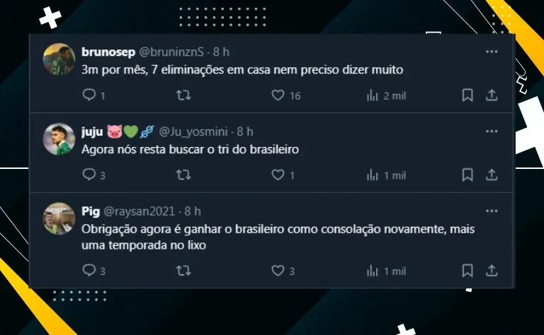 Pior temporada da “Era Abel” Olhando de forma geral, apesar de ter sido eliminado precocemente de dois dos três principais campeonatos da América do Sul, o Verdão ainda segue vivo na luta por um feito histórico. Como é o atual bicampeão do Brasileirão, o título em 2024 igualaria o feito de Muricy Ramalho no São Paulo, que conseguiu o tricampeonato seguido entre 2006 e 2008. Dito isso, falando especificamente do ano do Clube da Pompeia , vale ressaltar que, por mais que esteja no G-4 do Brasileirão, o desempenho nos últimos 11 jogos vem deixando a desejar. Foram três vitórias, cinco derrotas e três empates . Agora, eliminado de todas as competições ainda no mês de agosto, o Palmeiras terá apenas 15 partidas para disputar até o fim do ano, aumentando as semanas de descanso entre os duelos . O próximo jogo será sábado (24), contra o Cuiabá. Palmeirenses repercutem eliminação