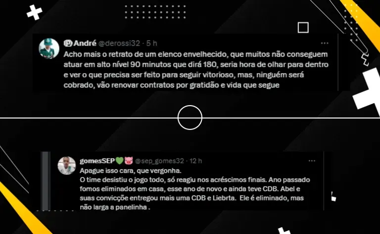Sofrimento com a eliminação Mais uma vez o sonho do tetracampeonato da Libertadores do Palmeiras ficou pelo caminho. A equipe caiu em casa nas oitavas de final da Copa Libertadores da América para o Botafogo. © Foto: Reprodução YouTube / Podpah Marcos, ex-goleiro do Palmeiras – Foto: Reprodução YouTube / Podpah A torcida ficou muito chateada com a eliminação. Um grande palmeirense na história é o ex-goleiro e ídolo Marcos. Ele se manifestou nas redes sociais sobre a dor da derrota nesta eliminação precoce. " Esse time me mata do coração. Eu estou até com dor no peito velho. Que final de jogo, Jesus Cristo. Agora eu estou naquela fase. O rival vai me zoar, o torcedor do Palmeiras vai dizer que sou passa pano, mas esse time é foda demais", declarou.