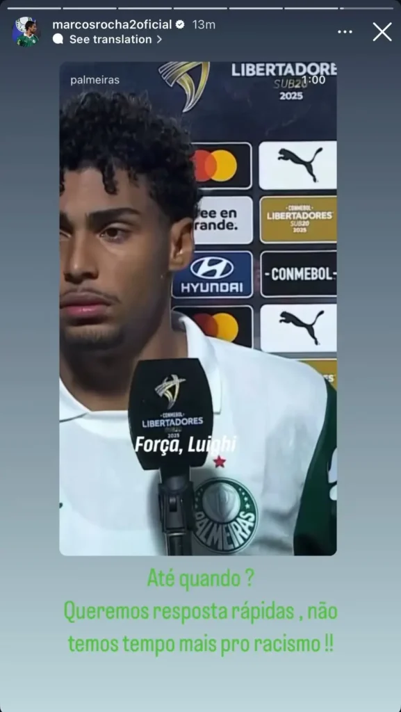 "Até quando? Queremos respostas rápidas, não temos tempo para o racismo", disse o lateral direito Marcos Rocha, que completou a Luighi: "Você é gigante, nós te amamos e estamos juntos com você". "Estamos com você, irmão", apoiou o meia Allan, com quem Luighi também atuou na base.