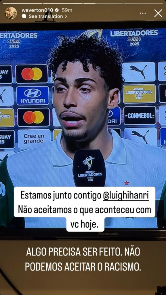 Jogadores do time profissional do Palmeiras se solidarizaram com Luighi, do sub-20, e manifestaram apoio ao atacante de 18 anos, que foi vítima de racismo na vitória sobre o Cerro Porteño, pela segunda rodada da fase de grupos da Libertadores sub-20. Nos perfis nas redes sociais, alguns deles deixaram mensagens ao camisa 9 da base. Antes de ir disputar a Libertadores na base, Luighi, que faz parte do grupo de apoio, estava à disposição de Abel Ferreira para a disputa do Paulistão. "Estamos juntos contigo, Luighi. Não aceitamos o que aconteceu com você hoje. Algo precisa ser feito. Não podemos aceitar o racismo", escreveu o goleiro Weverton. "Até quando?", publicou o meia Raphael Veiga.