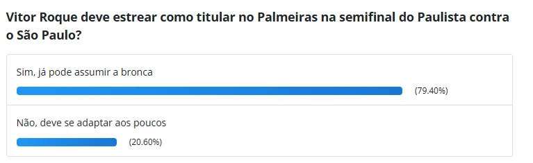 A torcida do Palmeiras está ansiosa pela estreia do atacante Vitor Roque, último reforço anunciado na janela de transferências internacionais. Em enquete realizada pela Gazeta Esportiva, os torcedores votaram que querem vê-lo como titular no que pode ser seu primeiro jogo: o clássico contra o São Paulo, pela semifinal do Campeonato Paulista. Palmeiras e São Paulo se enfrentam em jogo único na segunda-feira, a partir das 21h35 (de Brasília), no Allianz Parque. Com melhor campanha que o rival, na fase de grupos, o Verdão tem a vantagem do mando de campo. Na enquete, 79,40% dos torcedores votaram pela titularidade, enquanto 20,60% acreditam que Vitor deve se adaptar aos poucos.