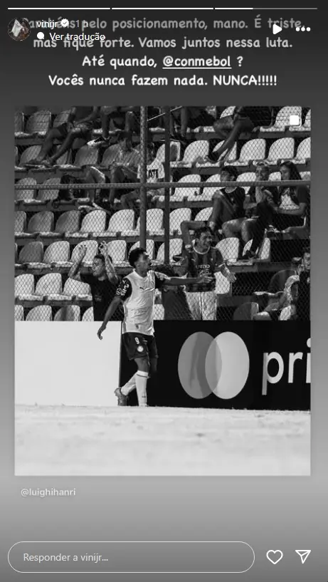 Através de seu Instagram, o atacante Vinicius Júnior saiu em defesa do jovem Luighi, de apenas 18 anos, que foi vítima de racismo em jogo da Libertadores Sub-20, defendendo as cores do Palmeiras . O astro do Real Madrid elogiou Luighi pelo forte posicionamento após o jogo, além de ter criticado a Conmebol, argumentando que a entidade sul-americana não faz nada diante dos inúmeros casos de preconceito racial em suas competições. "Parabéns pelo posicionamento, mano. É triste, mas fique forte. Vamos juntos nessa luta. Até quando, Conmebol? Vocês nunca fazem nada. Nunca”, publicou Vinicius Júnior.