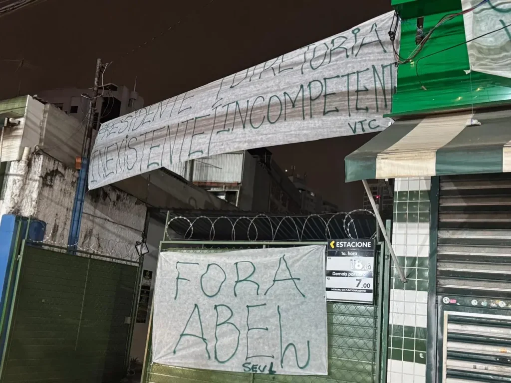 As manifestações dentro do Allianz Parque que antecederam o apito final da derrota do Palmeiras por 2 a 0 para o Corinthians não foram suficientes para os torcedores, que, após a saída do estádio, penduraram faixas ironizando Abel Ferreira, pedindo a saída do treinador e cobrando a diretoria, nos arredores. Três faixas foram estendidas em estabelecimentos de frente para o estádio, próximo da entrada do clube social. As faixas de cobrança a Abel tem os dizeres "Cabeça vazia, fralda cheia. Time cagão", ironizando o lema do português "cabeça fria, coração quente" E uma outra, os torcedores são enfáticos "Fora, Abel". Por último, críticas à presidente Leila Pereira e à diretoria do clube "Presidente inexistente, diretoria incompetente". Torcedores do Palmeias estendem faixas próximo do Allianz em protesto após eliminação na Copa do Brasil (Foto: Victória Romanelli/Gazeta Press)