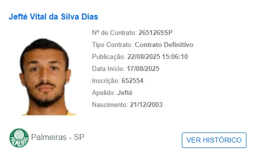 Antes dele chegar, o técnico Abel Ferreira relacionou Arthur, do sub-20 para os jogos do Verdão. O jogador, que se destacou pela base do Fluminense antes de defender o Rangers, da Escócia, assinou um vínculo com o Palmeiras até julho de 2030. Integrado ao elenco, Jefté tem mais dois dias de treino com o elenco para se preparar para o jogo contra o Sport.