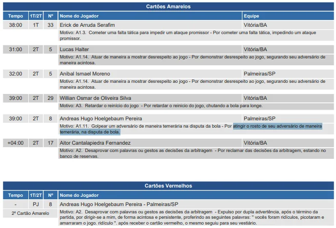 Na última quarta-feira, o meio-campista do Palmeiras, Andreas Pereira, foi expulso após o empate sem gols contra o Vitória, em partida válida pela 37ª rodada do Campeonato Brasileiro, realizada no Allianz Parque. O árbitro Lucas Paulo Torezin detalhou na súmula os motivos da expulsão do jogador, que aconteceu após o apito final. Segundo o documento, Andreas foi expulso por ter se dirigido ao árbitro de forma acintosa, proferindo palavras como "Vocês foram ridículos, picotaram e amarraram o jogo. Ridículo."