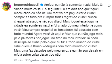 Bruno também expressou a frustração de ser criticado por ter jogado em sua cidade natal, onde cresceu. "Agora você vem aqui e fala que eu não jogo mais pelo Palmeiras porque joguei no time do meu interior! Já pedi desculpas ao clube pelo que eu fiz!", comentou. Ele também fez questão de lembrar que todos no clube conhecem seu valor e caráter.
