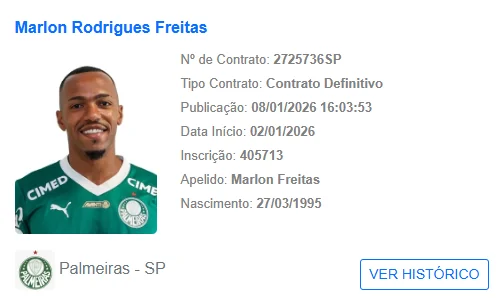 Com 30 anos, Marlon Freitas é o primeiro reforço do Palmeiras para a temporada de 2026. Após um período de três temporadas no Botafogo, onde se destacou, o atleta assinou um contrato com o clube paulista até o final de 2028. Ele vestirá a camisa 27 e chega com o objetivo de fortalecer o meio-campo da equipe. Durante sua apresentação, Marlon expressou seu compromisso em adaptar-se às necessidades do técnico: “Jogar de cinco e de oito, eu não vejo problema nenhum. Vai depender muito do mister Abel. O importante é estar à disposição e entender a filosofia de trabalho dele”, afirmou.