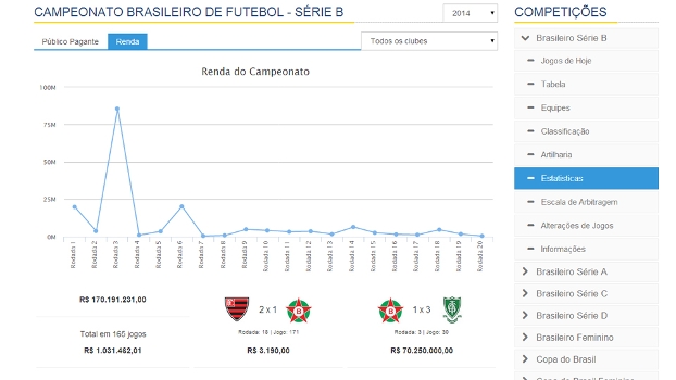 Na Série B, a situação é a mesma: o site da CBF dá R$ 1.031.462,01 como média de renda, mas a realidade é muito diferente: R$ 87.462,20.
